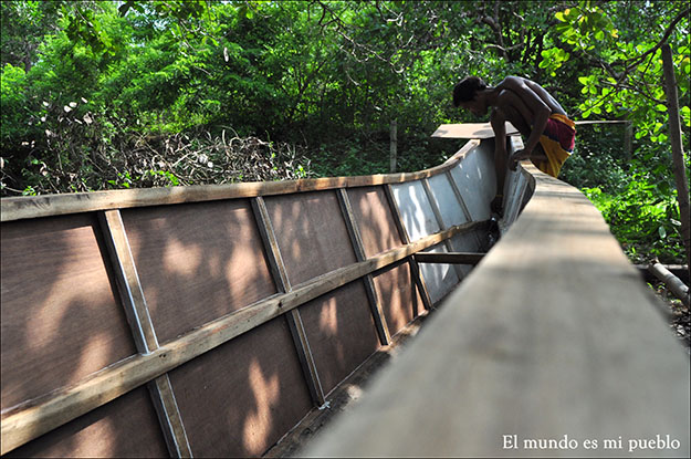 Llegamos a una de las casas en medio del bosque. Una casa hecha con bambú rodeada de niños y niñas de todas las edades, de gallinas y sus pollitos, de gatos, de cachorros de perro y también de mucho plástico, envoltorios de plástico de caramelos, de patatas, de bollos…En el otro lado de la casa un hombre trabaja en una barca de madera, ya tiene forma, le falta poco para acabarla. Ese es su medio de subsistencia, un medio para poder pescar lo que necesita su comunidad para un día.