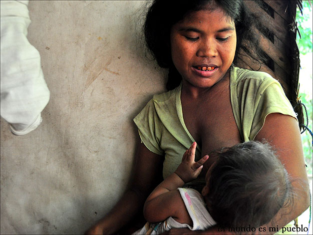 Leya acostumbra a mascar nuez de areca envuelta por hoja de betel, es por eso que sus dientes han tomado un color rojo perpetuo. Esta costumbre está extendida por muchos países del sudeste asiático para combatir la halitosis, aunque muchos lo usan como estimulante y tiene efectos adictivos. En Filipinas no es una costumbre entre las personas de ciudad, Jerry me hace hincapié en esa costumbre de la tribu y parece perplejo cuando ve que las mujeres mascan betel. Leya no deja de sonreír, el pastor Nonoy Orrtiz y mi amigo Jerry son los traductores de todas las preguntas que se me pasan por la cabeza. Leya y yo no nos podemos entender oralmente, pero los ojos, las sonrisas y los gestos que nos intercambiamos son de un gran valor para mí.