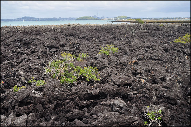 Mckenzie Bay Road,suelo de lava volcánica y vistas de la ciudad de Auckland al fondo